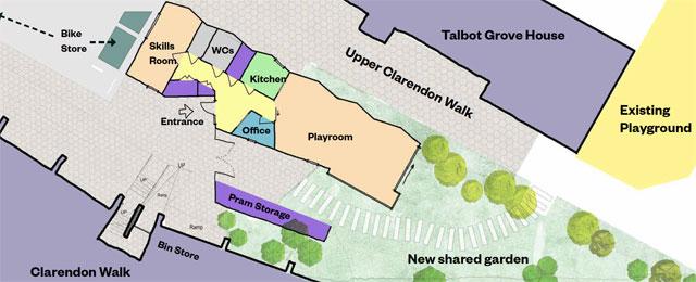 The proposal would provide two key spaces for use by the drop-in and the local community. A large playroom opens out into the shared garden and a smaller room at the other end of the building would provide space for community skills and learning courses. A reception area, toilets, and a small kitchen would service these spaces and a secure pram store is provided outside for when the building is in use.