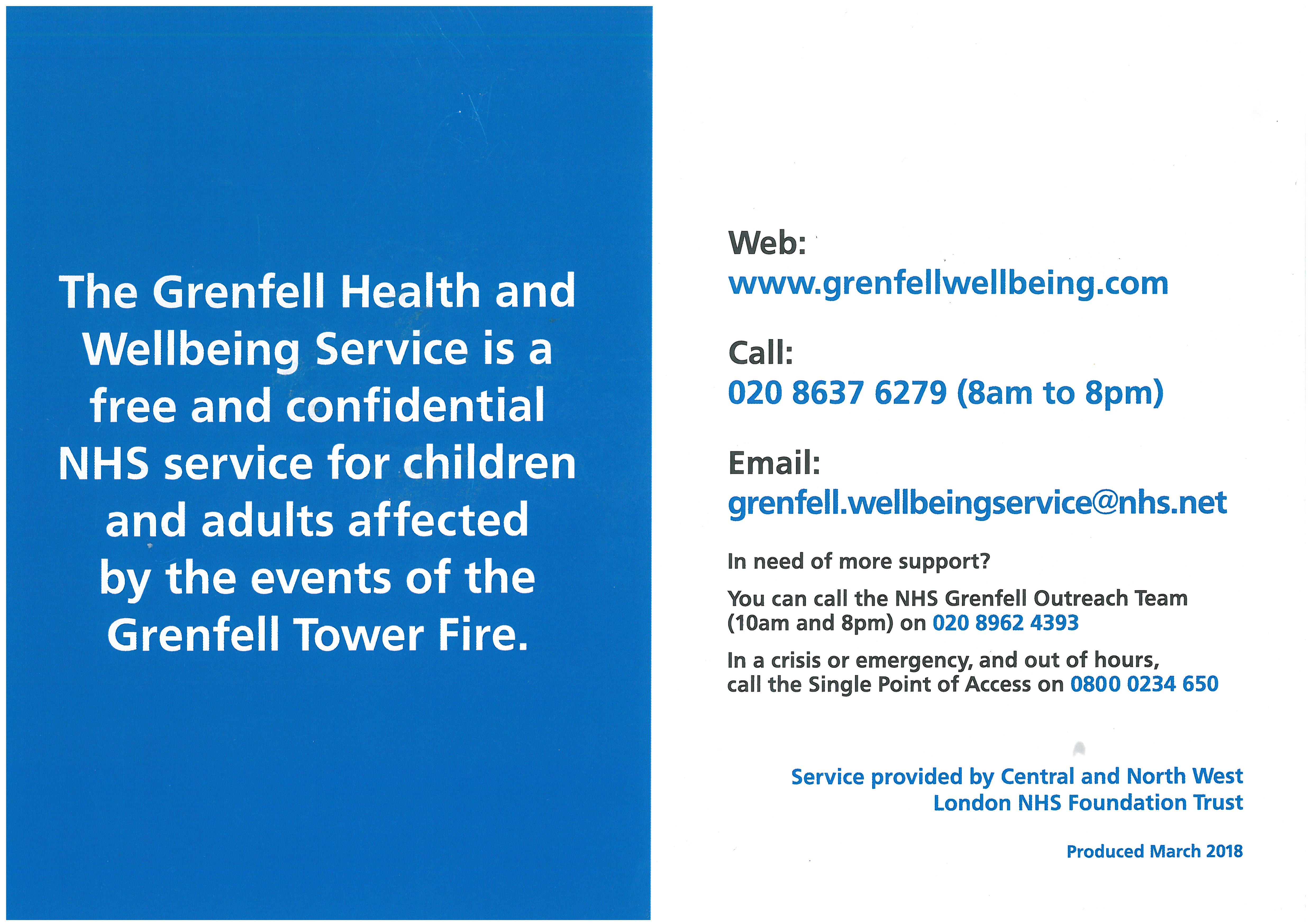 Support is provided through The Grenfell Recovery College workshops and the NHS Dedicated Service.