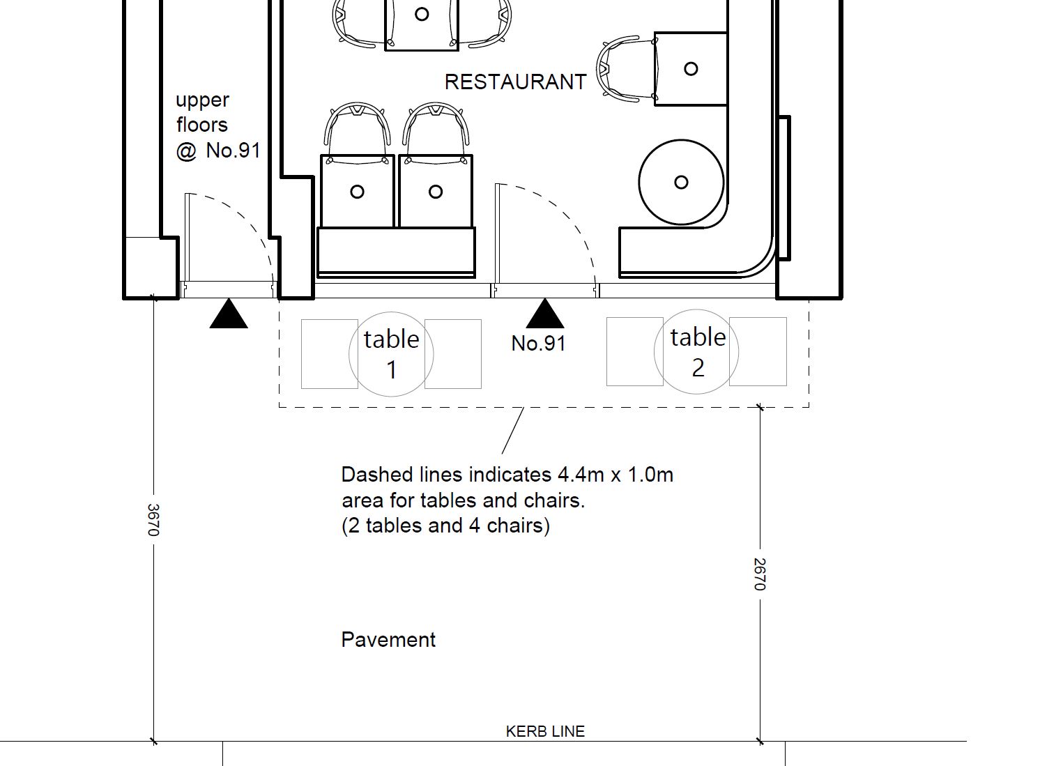 Application Details: | Placement of two tables and four chairs on the Golborne Road frontage between 8am and 10pm Mondays to Sundays |