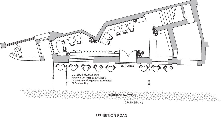 Application Details: | Placement of eight tables and 16 chairs on the Exhibition Road frontage between the hours of 8am and 10pm on Mondays to SundaysNo planters or a-boards to be placed on the frontage at any time. |